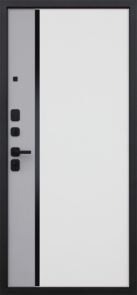 Порошковое покрытие “муар черный” Панель МДФ 10 мм. Объемная фрезеровка. Цветовая комбинация: “дуб галиф натур”, “шагрень черная”. Декоративная пластиковая вставка, цвет "черный". Наличник МДФ 80 мм., цвет “черный кварц”.